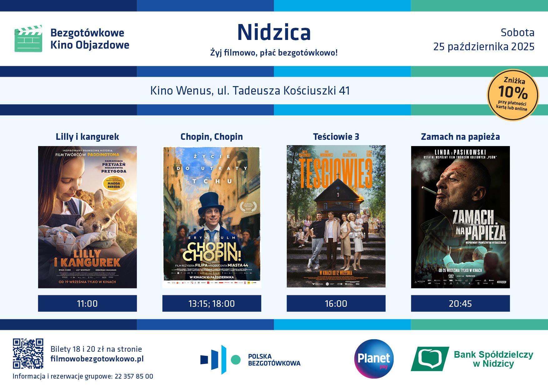Dla wszystkich widzów Bezgotówkowego Kina Objazdowego, którzy dokonają płatności na stronie www.filmowobezgotowkowo.pl lub bezgotówkowo w kasie kina bądź w barku kinowym, przewidziano 10% zniżki na bilety i zestawy kinowe.